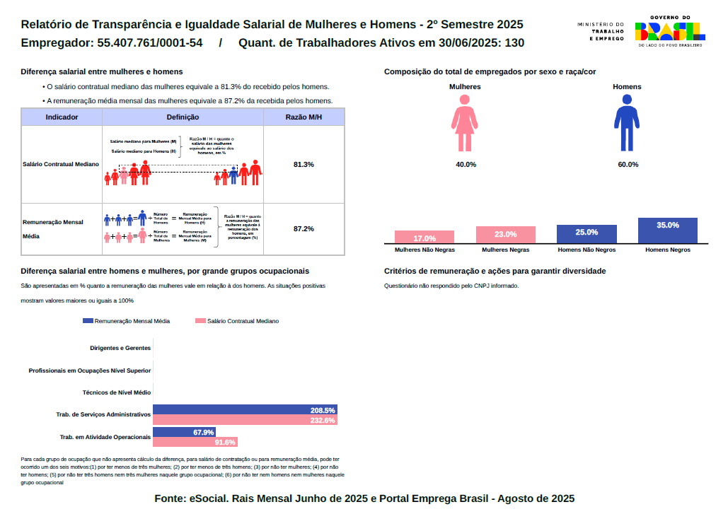 Conforme determinação estabelecida pela Portaria MTE nº. 3.714 de 2023 e pelo Decreto Federal nº 11.795 de 2023, que regulamentaram as obrigações oriundas da Lei de Igualdade Salarial (Lei nº. 14.611 de 2023), todas as empresas com mais de 100 empregados devem publicar semestralmente o relatório disponibilizado pelo Ministério do Trabalho e Emprego (“MTE”), contendo as médias e medianas das remunerações anuais, este primeiro baseado nos dados do eSocial de dezembro de 2022 e com a utilização do CBO (Código Brasileiro de Ocupações).